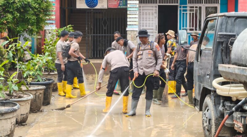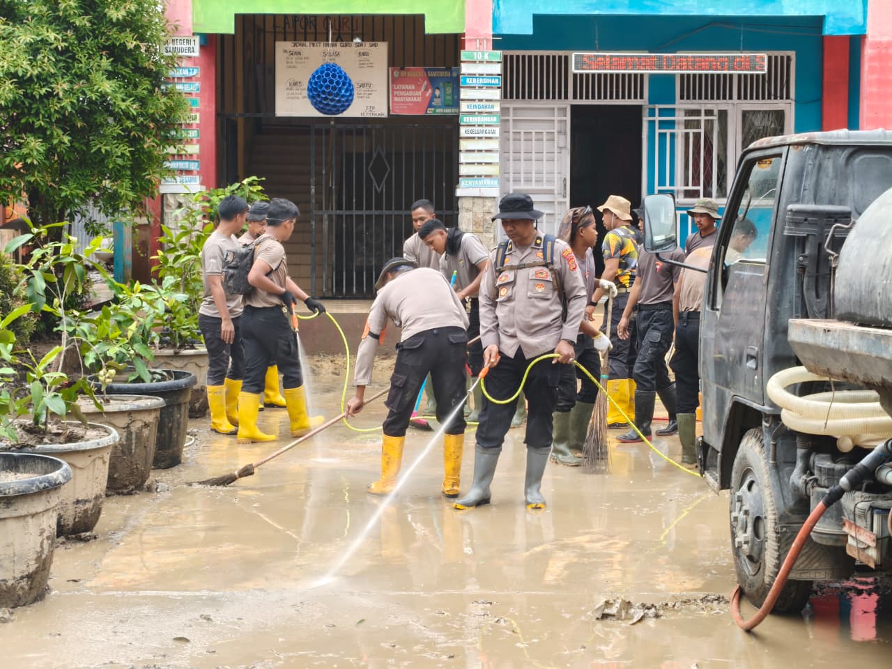 Sebelum bergerak ke lokasi, rangkaian kegiatan diawali dengan apel gabungan di lapangan apel Mapolres Lhokseumawe yang dipimpin langsung oleh Kabagren Polres Lhokseumawe, Kompol Anwar, S.H. Dalam apel tersebut, dilakukan koordinasi intensif mengenai ploting wilayah dan teknis pembersihan agar pelaksanaan tugas di lapangan berjalan efektif dan efisien. Segera setelah apel selesai, seluruh personel melaksanakan pergeseran pasukan (Serpas) menuju sekolah sasaran. Setibanya di lokasi, para personel baret biru ini dengan sigap menggunakan peralatan manual maupun bantuan air untuk menyapu bersih lumpur yang menutupi lantai kelas dan akses jalan, memastikan lingkungan sekolah kembali steril dan bersih.