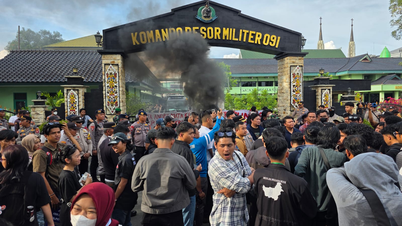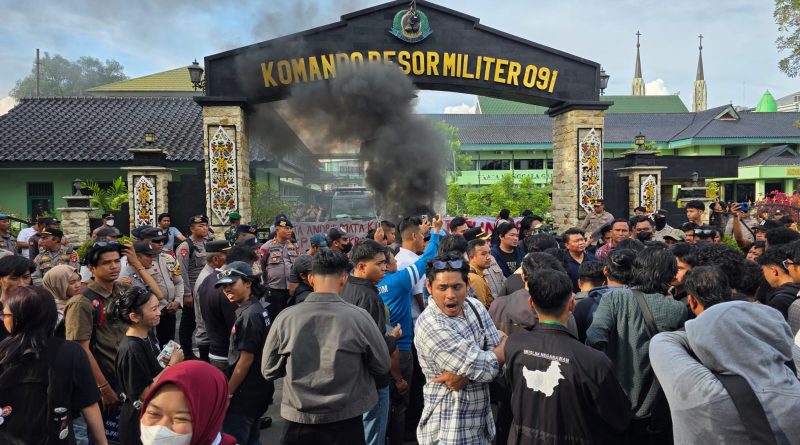 Samarinda – Guna menjamin ketertiban umum dan kelancaran penyampaian aspirasi masyarakat, satu Satuan Setingkat Kompi (SSK) personel Batalyon B Pelopor Satbrimob Polda Kaltim dikerahkan untuk mengamankan aksi unjuk rasa oleh Aliansi Gerakan Rakyat Menggugat (GERAM) di depan Makorem 091/ASN Samarinda, Rabu (08/04/2026). Di bawah pimpinan Ipda Agus Purnomo, personel baret biru ini telah bersiaga sejak pagi untuk melakukan pengawalan jalannya aksi yang diikuti oleh puluhan mahasiswa tersebut. Meskipun massa sempat melakukan pembakaran ban bekas di depan gerbang Makorem sebagai bentuk protes, situasi tetap terkendali berkat kesiapsiagaan personel di lapangan yang tetap tenang dan tidak terpancing provokasi, sehingga penyampaian aspirasi dapat berlangsung tanpa menjurus ke tindakan anarkis.