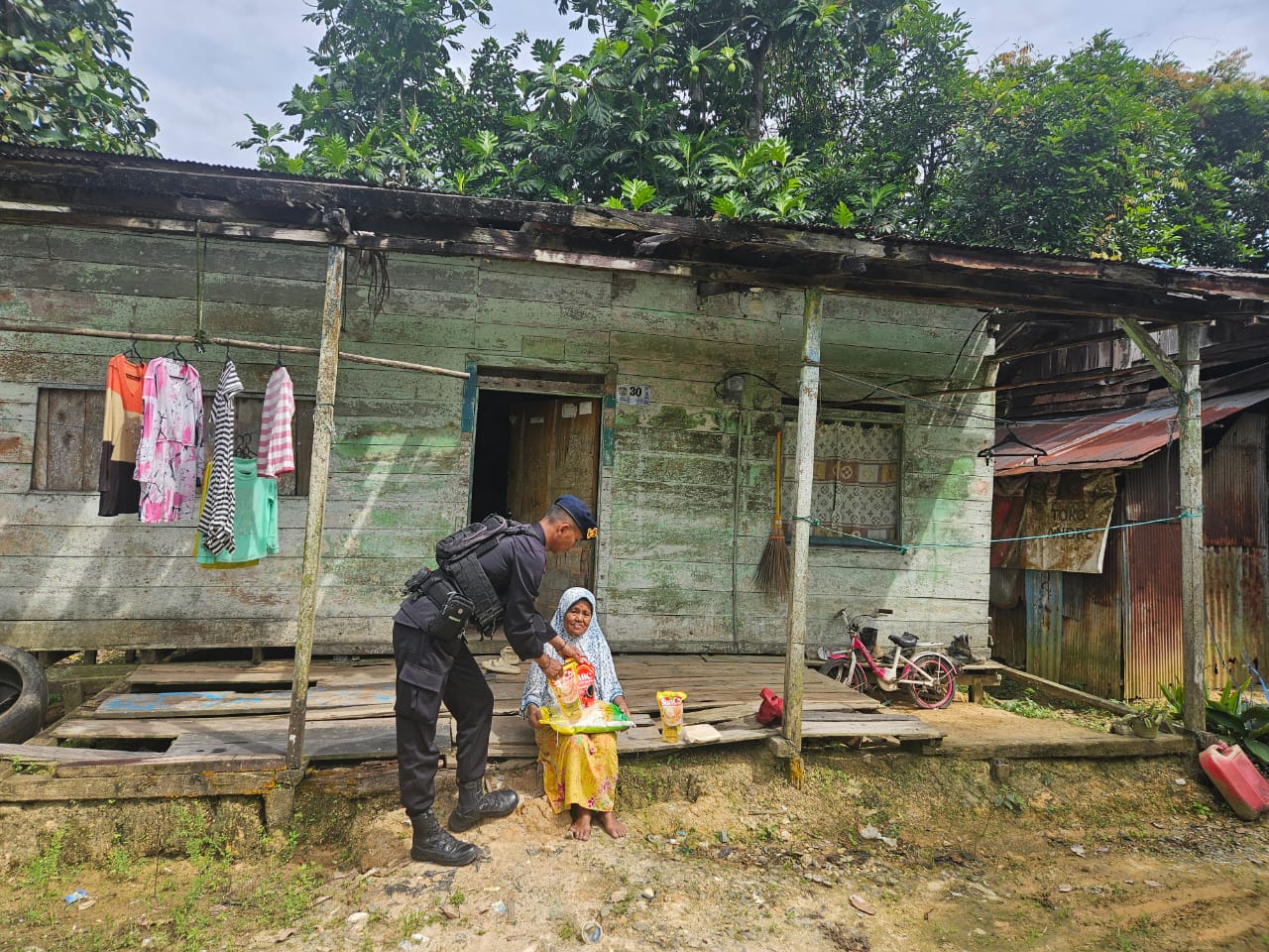 Personel Brimob menyerahkan paket bantuan sembako secara langsung kepada Ibu Warsiti. Selain menyerahkan bantuan, personel juga menyempatkan diri berdialog dan memastikan kondisi kesehatan serta kebutuhan Ibu Warsiti. Pendekatan humanis ini menunjukkan bahwa Korps Brimob tidak hanya fokus pada tugas-tugas penegakan hukum dan keamanan, tetapi juga aktif dalam aksi kemanusiaan dan sosial.