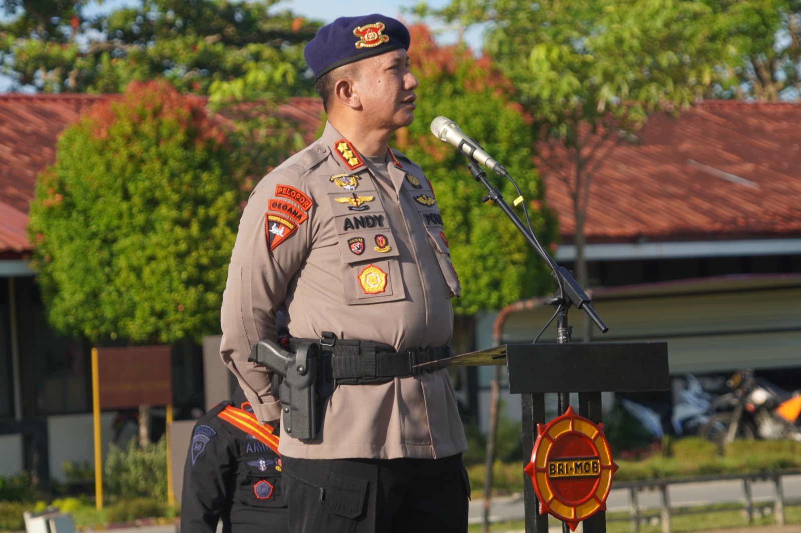 Balikpapan – Memperkuat soliditas dan kesiapsiagaan operasional personel, Komandan Satuan (Dansat) Brimob Polda Kaltim, Kombes Pol. Andy Rifai, S.I.K., M.H., memimpin langsung Apel Satuan Kesiapsiagaan di Lapangan M. Jasin, Mako Brimob Stalkuda, Balikpapan, pada Rabu (08/04/2026). Upel siaga ini dihadiri oleh jajaran pejabat utama, di antaranya Wadansat AKBP Muhammad Alli, S.I.K., Danden Gegana Kompol Komank Adhi Andhika, Danyon A Pelopor Kompol Iwan Pamuji, Danyon B Pelopor Kompol Edy Musdwiyono, serta Danyon C Pelopor Kompol Ahmad Supriyadi. Kehadiran seluruh elemen pimpinan unit ini menegaskan komitmen kolektif Satbrimob Polda Kaltim dalam menjaga stabilitas keamanan di wilayah Kalimantan Timur melalui struktur komando yang solid dan terintegrasi.
