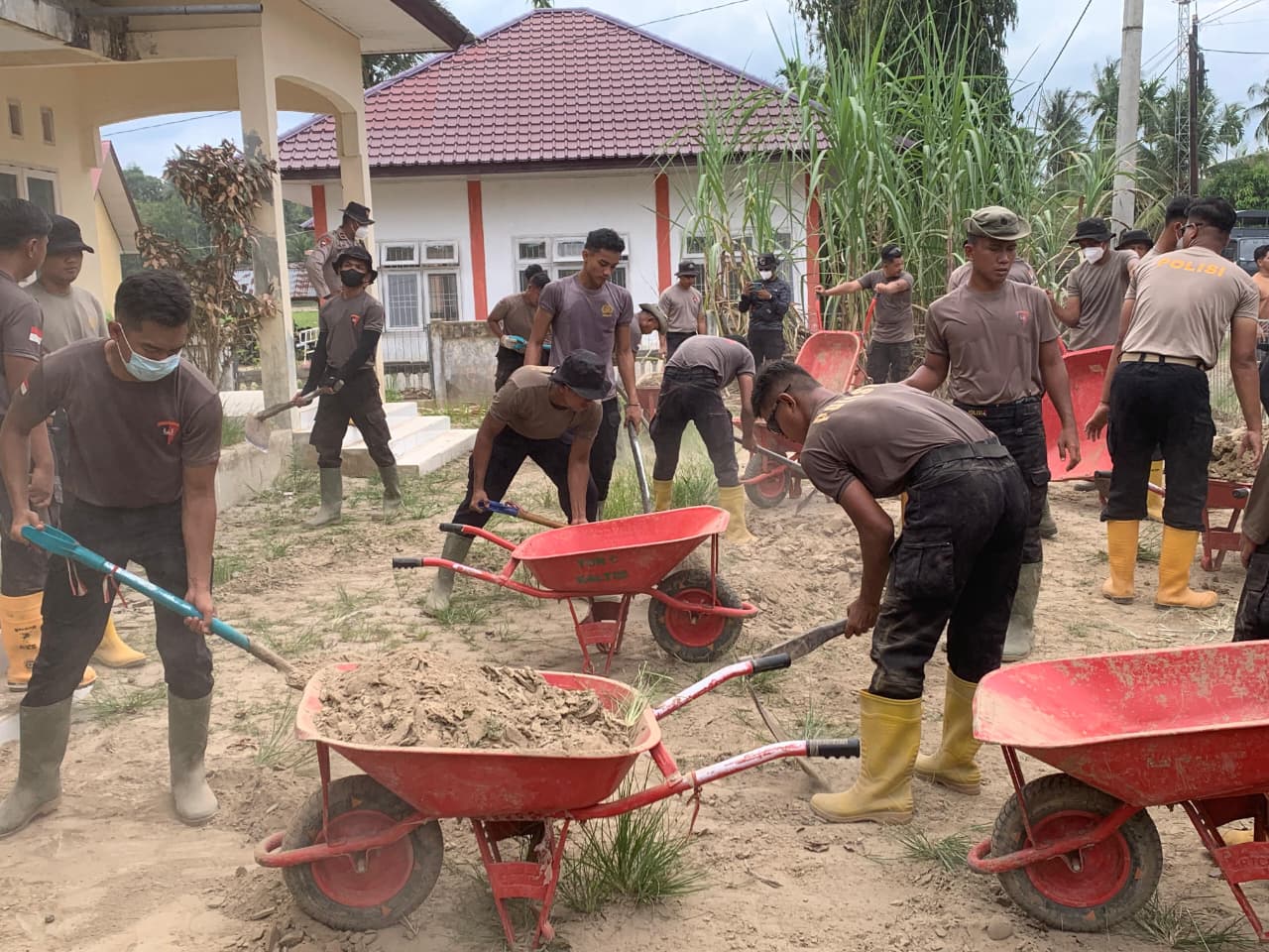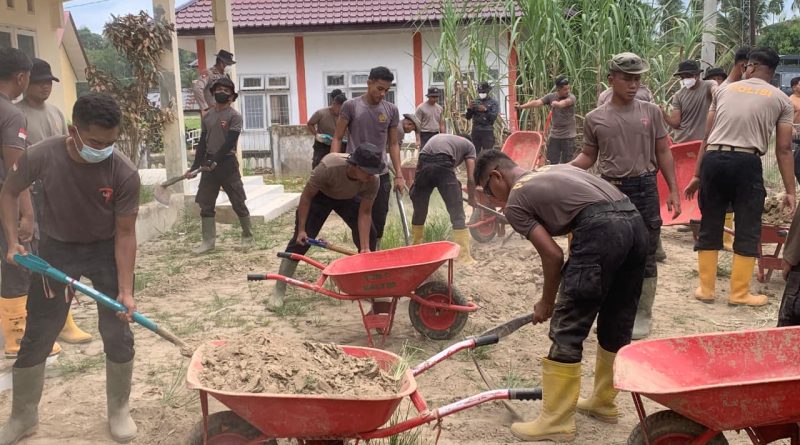 Pulihkan Fasilitas Kesehatan, Personel BKO Brimob Kaltim Bersihkan Lumpur di Posyandu Seulanga Aceh Utara