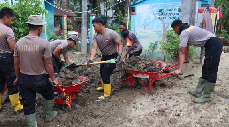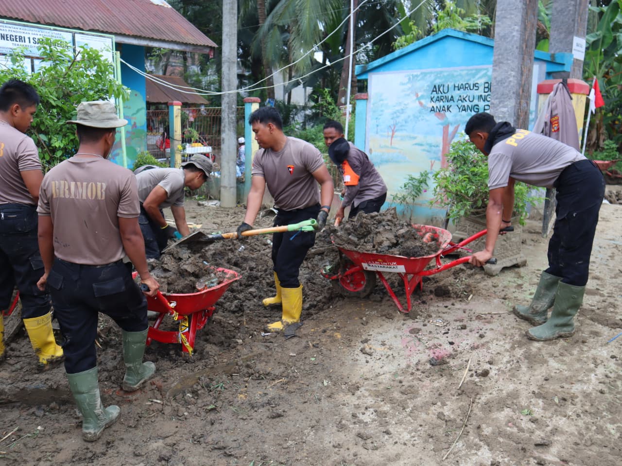 AKP Elan Suherlan, S.H. menyampaikan bahwa kegiatan ini merupakan wujud kepedulian dan tanggung jawab Polri terhadap masyarakat yang terdampak bencana. “Kami hadir untuk membantu meringankan beban masyarakat serta memastikan fasilitas umum, khususnya sekolah, dapat segera kembali berfungsi dengan baik,” ujarnya di sela-sela kegiatan. Seluruh personel juga tetap mengedepankan keselamatan serta soliditas dalam pelaksanaan tugas di lapangan.
