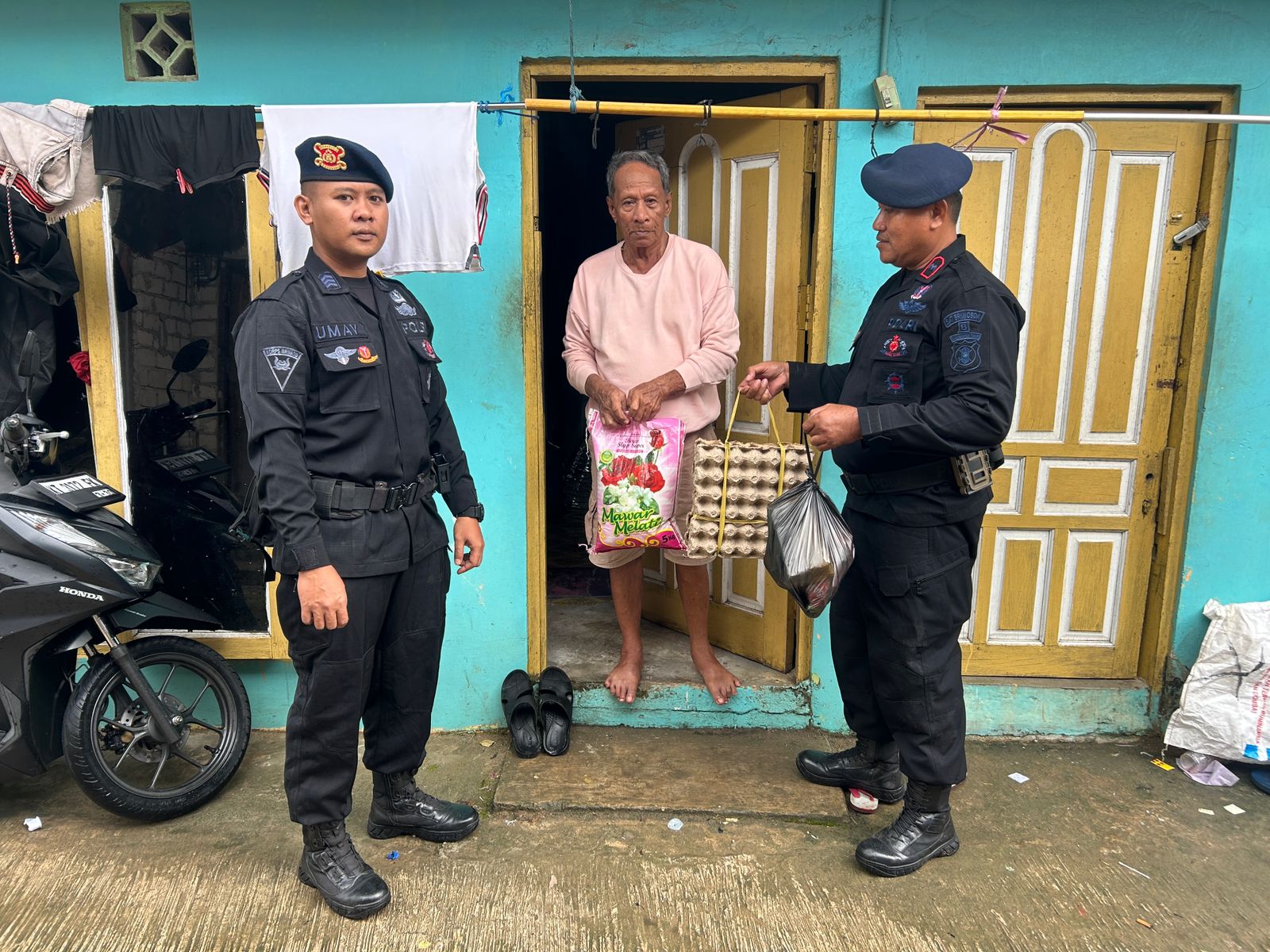 Samarinda – Mengukuhkan peran sebagai pengayom masyarakat, jajaran Satuan Brimob Polda Kaltim kembali menebar kebaikan melalui aksi sosial yang menyentuh lapisan masyarakat terbawah. Pada Jumat (10/04/2026), tiga personel dari Kompi 1 Batalyon B Pelopor Samarinda yang dipimpin oleh Aipda Zainuddin melaksanakan program “Bakti Brimob untuk Masyarakat” melalui agenda “Bantuan Kemanusiaan untuk Negeri”. Dalam giat Jumat Berkah kali ini, tim menyambangi langsung kediaman Bapak Abdul Hamid (78) dan Ibu Rukayah (45) yang beralamat di Jalan K.H. Harun Nafsi, Kelurahan Rapak Dalam, Kecamatan Loa Janan Ilir, Kota Samarinda. Penyerahan paket sembako ini dilakukan secara door-to-door guna memastikan bantuan tersalurkan tepat sasaran sekaligus sebagai sarana memperkuat tali silaturahmi antara Korps Baret Biru dan warga setempat.